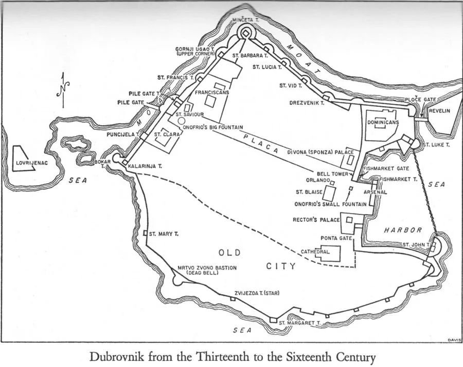 The Northern Wall of the city is the highest to defend against the nearby Slavs. The western wall included the western part of the rock overlooking the bay. From the Castellum the additional portions of the city included Saint Peter and Pustijerna with the St Blaise church greeting those who crossed the bridge to Dubrovnik, and a lookout tower added in 972 on the mainland looking towards Srdj Mountain that rose 1,400 feet into the air at the time.