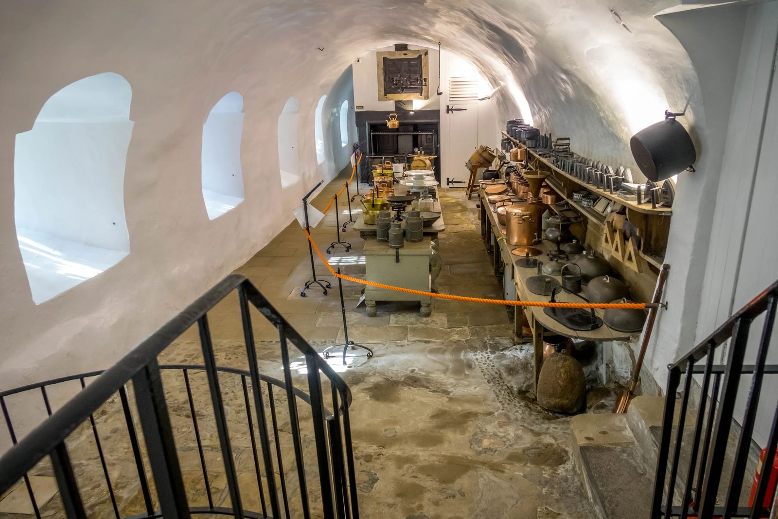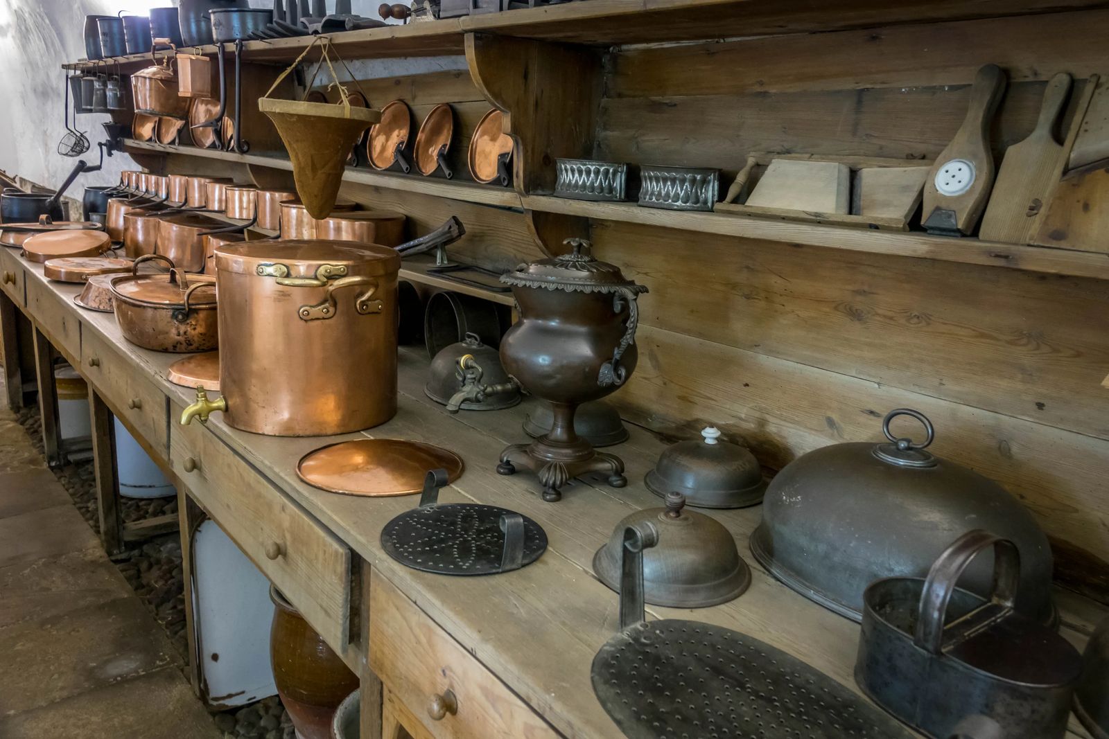 There are two kitchens, a modern kitchen and the original kitchen complete with a well, a cooling cupboard (seen at the end of the long counter). Copper pots, measuring devices and more.
