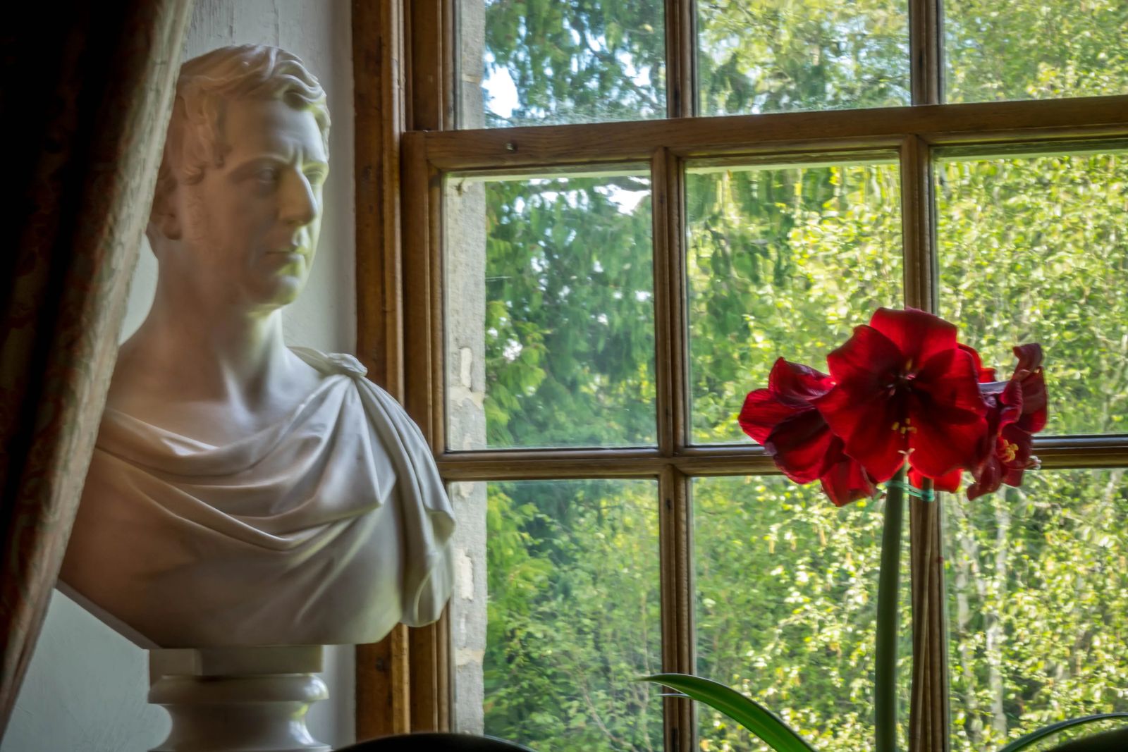 Here you see the grand entrance to Cawdor castle, complete with a grand piano and a fireplace that has the family symbol of the Stag's head with a buckle. Statues and topiary's, with fresh flowers, adorn the room to give it life. Notice the wooden pillars that are supported by the stones. This is classic of the 16th-century architectural style.