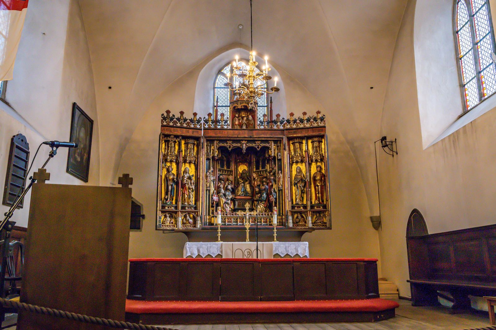 The main wooden altarpiece was made by Bernt Notke was completed in 1483. He was one of the most important masters of the German Late Gothic style. His family were wealthy mariners' from Flanders.