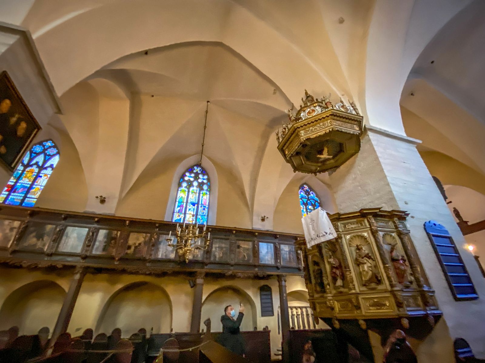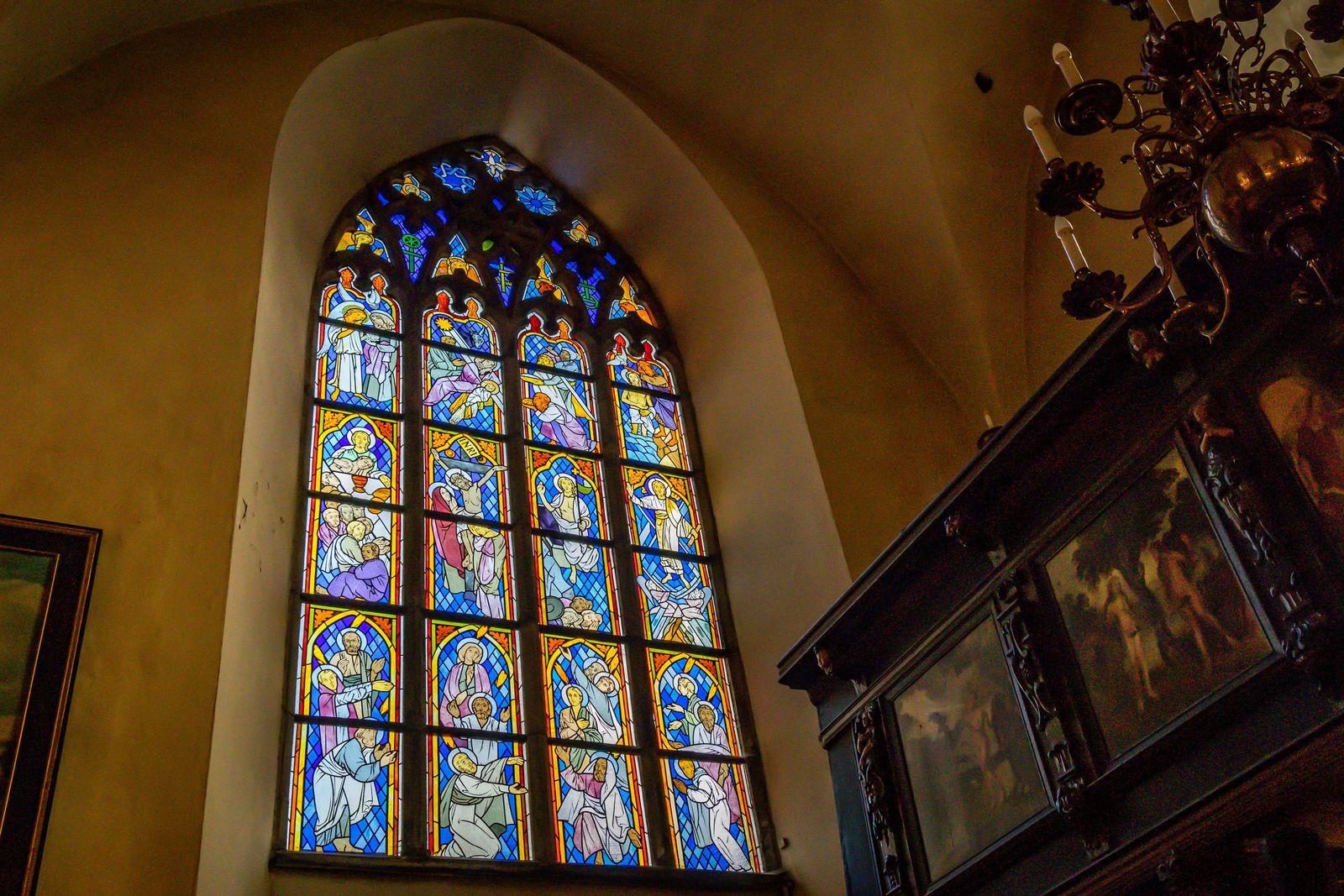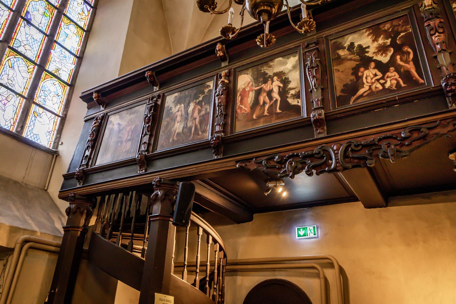 The wooden galleries where patrons would stand to hear the sermons are decorated with scenes from the Bible. These scenes were painted in the 17th century, and Gothic stained glass windows were added as well.