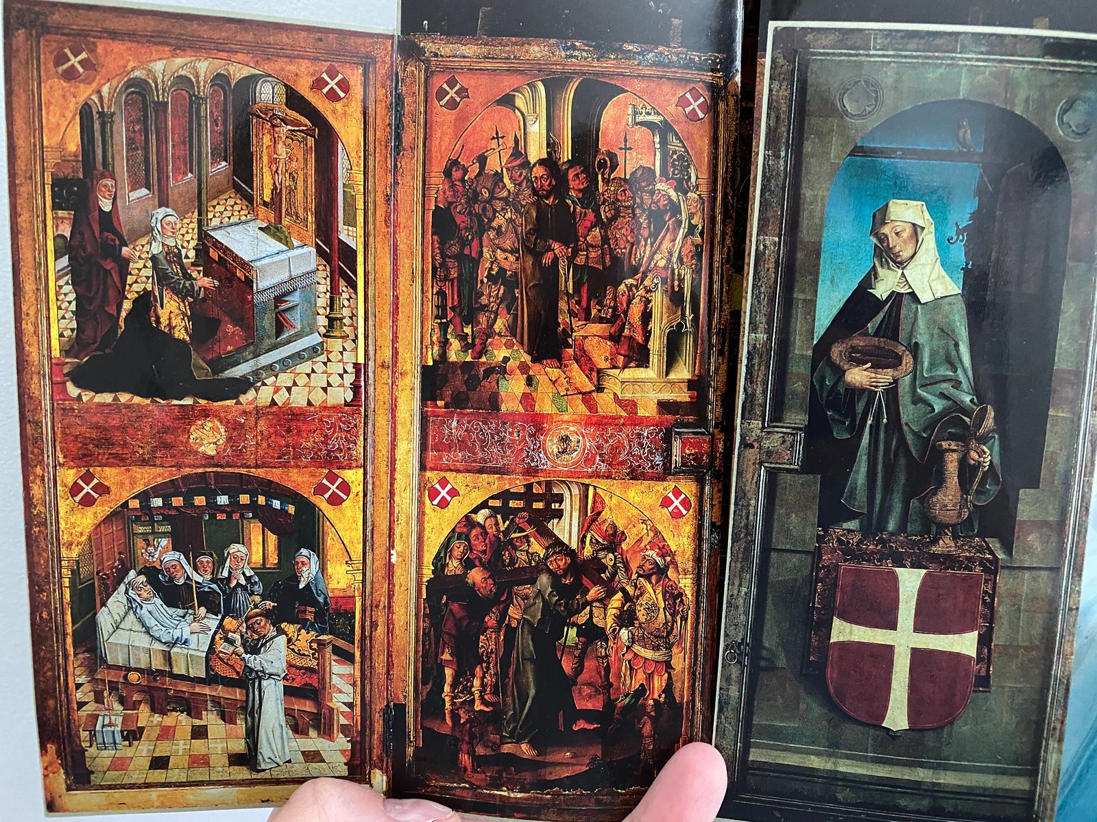 The left wing shows her praying in front of a cross, St Elisabeth on her deathbed, prayers of friends and family, prayer symbolized by burning candles, victory over evil symbolized by a cat under her bed catching a rat.