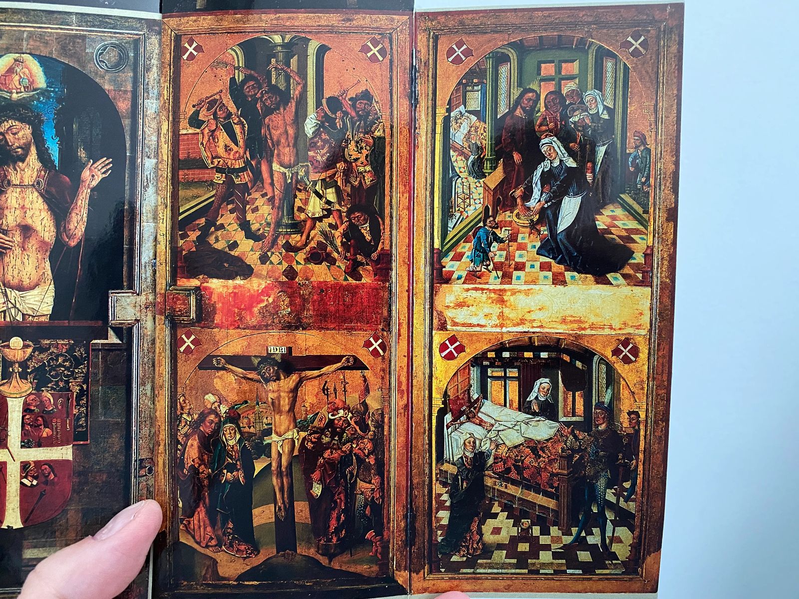 Two of the pictures show the passion of the Christ, or when he is portrayed as being whipped and crucified. To the right of Jesus is the apostle John and the Virgin Mary. Behind them are two crying Mary's. The people who cruicified Jesus stand to his left, and a man holds a scroll from Pilate with his instructions to kill Jesus.