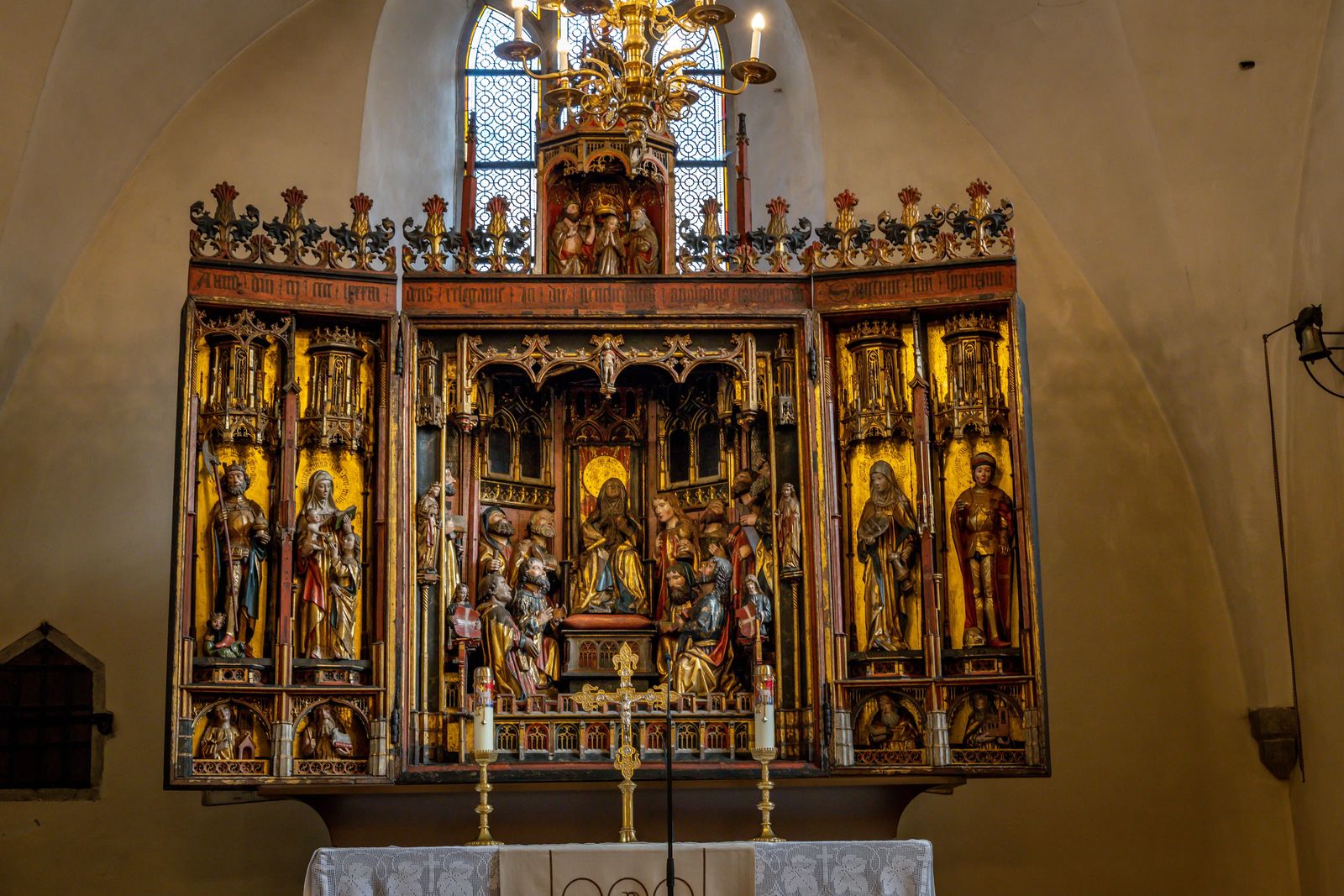 The altarpiece is considered one of the most outstanding chef-d'oeuvres of Estonian medieval art. If you look closely you can see the coat of arms for Estonia, not for Germany throughout the altarpiece which means it was specifically made for the Church of the Holy Spirit.