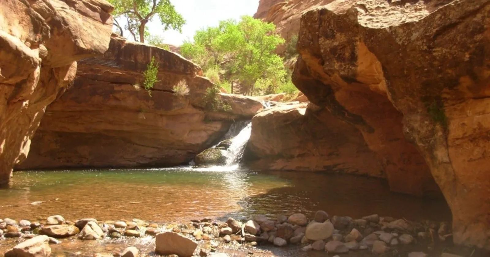 The start of this hike is just outside of Moab. Getting out of the car, and starting along the trail, it won't take you very long at all to get to the first swimming hole and waterfall (man made). If you are looking for just a quick dip to get cool, go ahead and spend some time here to cool off a bit. Make sure to keep going up the canyon, you will find more swimming holes, waterfalls, and see some native american petroglyphs on the cliff side.