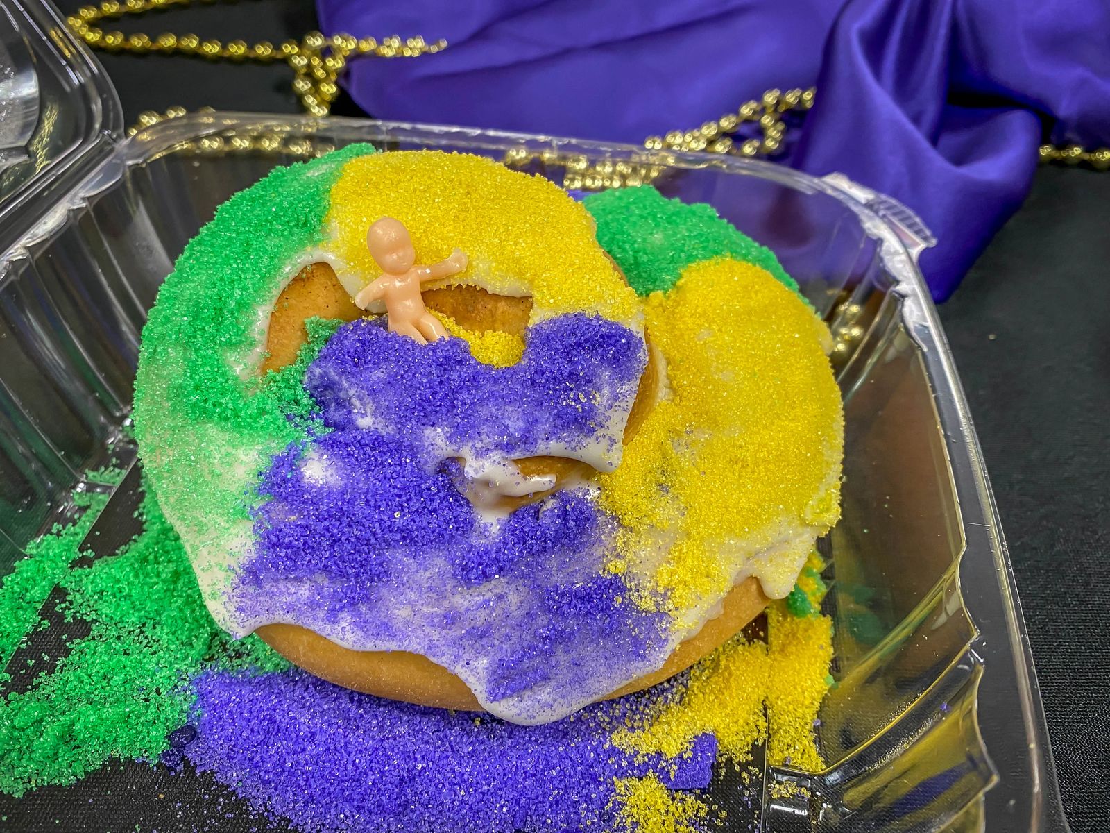 The three main colors are Purple, Green, and Gold (black is also commonly used). Purple stands for Justice, Green is for Faith, and Gold is for Power. The cake itself was a carnival tradition brought over from France. There is a tiny baby Jesus figurine inside. It is the symbol of the epiphany, the day that the 3 kings brought the baby Jesus gifts.