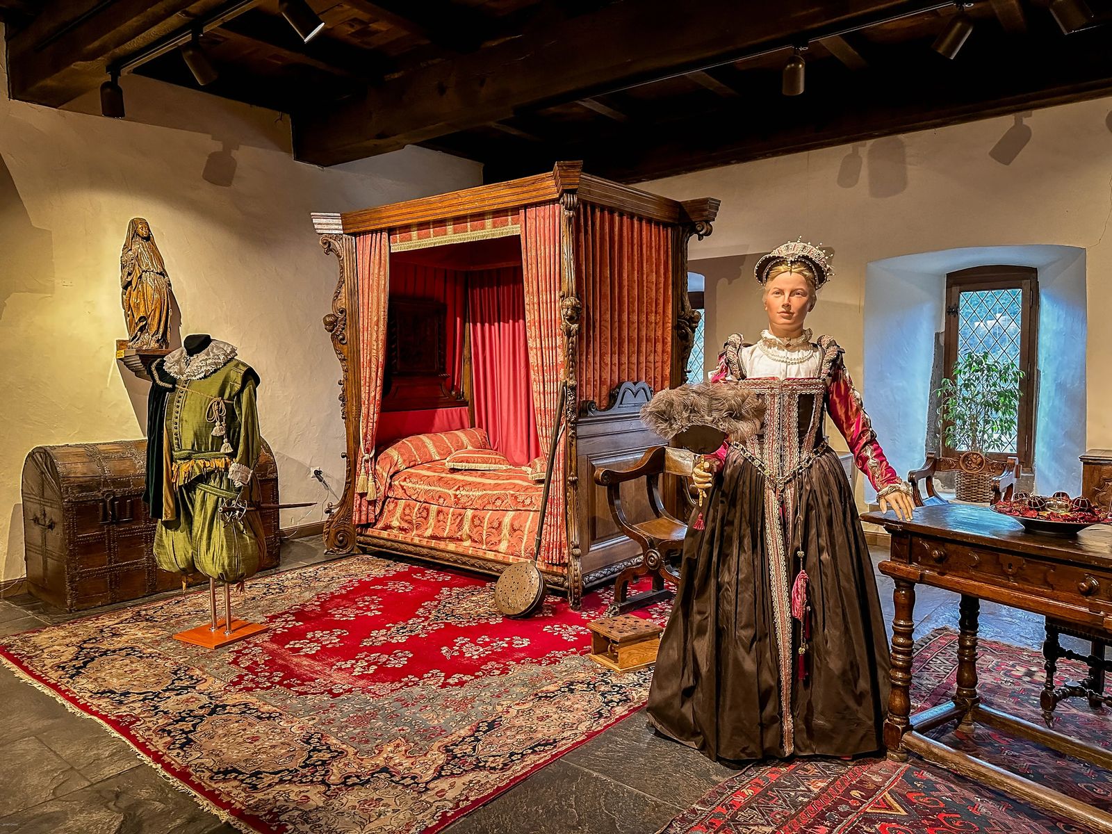 There is a room dedicated to armor of the knights through the centuries, two or three rooms with medieval & renaissance garb with traditional furniture from those time periods as well. The chapel is beautiful with gothic arches, colorful pillars, and a simple alter.